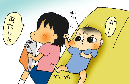 湿疹がひどくなるにつれて、手で顔をガシガシするようになって、気になって、そばを離れなれなくなり。