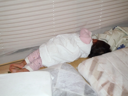 コタツで丸くなるおとうぱんと、パンツいっちょで走り回る長女ちゃん。。