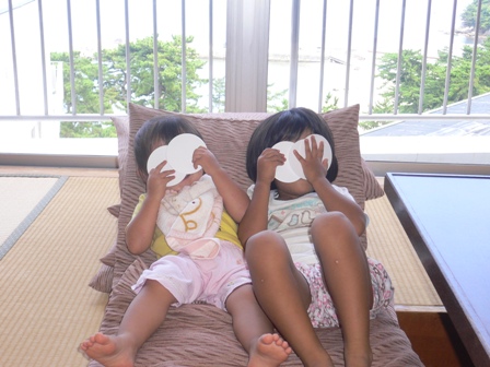 おなかいっぱいになって、座布団を積んで、はしゃぐ長女と次女。