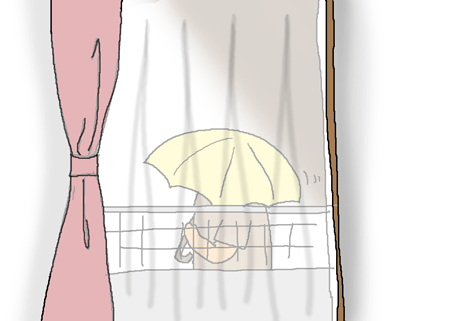 そしたら。レースのカーテン越しに、その日傘をさしたおばちゃんがすすすーーーと、通り過ぎていったのさ。