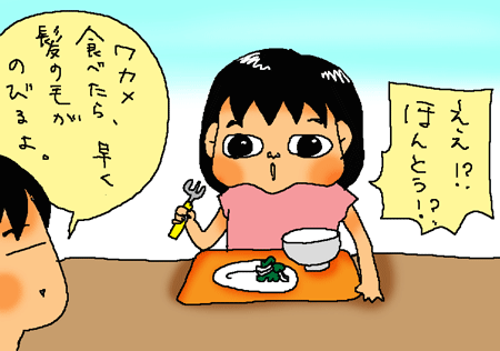 「ホント!ワカメには髪の毛を伸ばす栄養がたくさん詰まってるんだから」