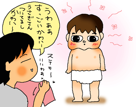 「このズボンは・・・ほーーら・・・えーーーっと・・・(ほめるところがない・・・)まあ、なんでもいいや。とにかく!かわいいーーーー!」