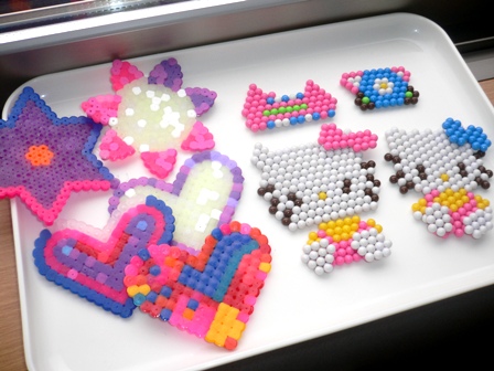 5ミリくらいのプラスチックのビーズを並べて、いろんな形や模様を作ります。んで、それをアイロンでジューっと押さえると、ビーズがくっついてかわいいオブジェが出来るというもの。