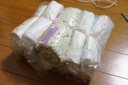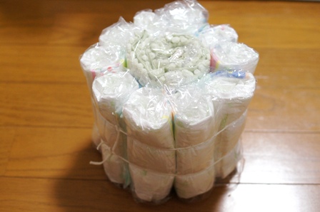下の段と同じように少し枚数を減らしてまとめてもいいと思いますが、上は丸い形にしたかったので、個包装おむつを使うことにしました。