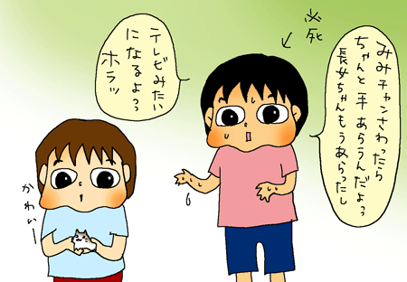 みみチャンはかわいいので、長女ちゃんも次女ちゃんもお世話をして、構いたがるのだけど・・・