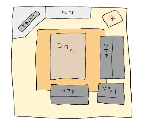 ソファは座椅子みたいにぺったんこなタイプ。3つに分かれていてコーナー型にくっつけておいてあるんだけど、この隙間にリモコンが落ちてることはよくあることで。