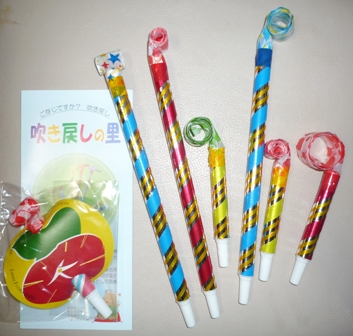 吹くと棒の先についた紙がぴろーっと伸びて、くるくる~っと戻ってくるアレです。