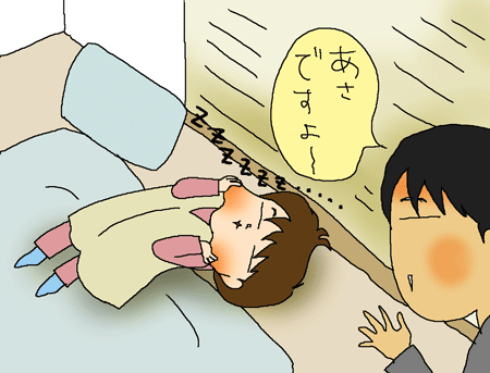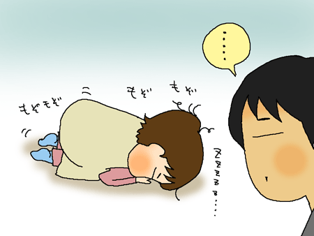 布団からははみ出て、枕を蹴散らし、壁際に寝返りうって~方向転換。