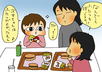 ちゃんと、ひとり1個ずつのチーズバーガーとドリンク&ポテト三つを確保してですよ。