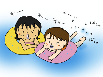 長女ちゃんと次女ちゃんはうきわに乗って流れるプールをぐーるぐる。