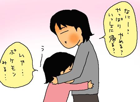 そこで、帰る気にさせるのにいつも「じゃあ、ここで泊まってく?お泊りして見たらいいでしょー、おかあぱんは帰るからー」ってなことを言うのです。